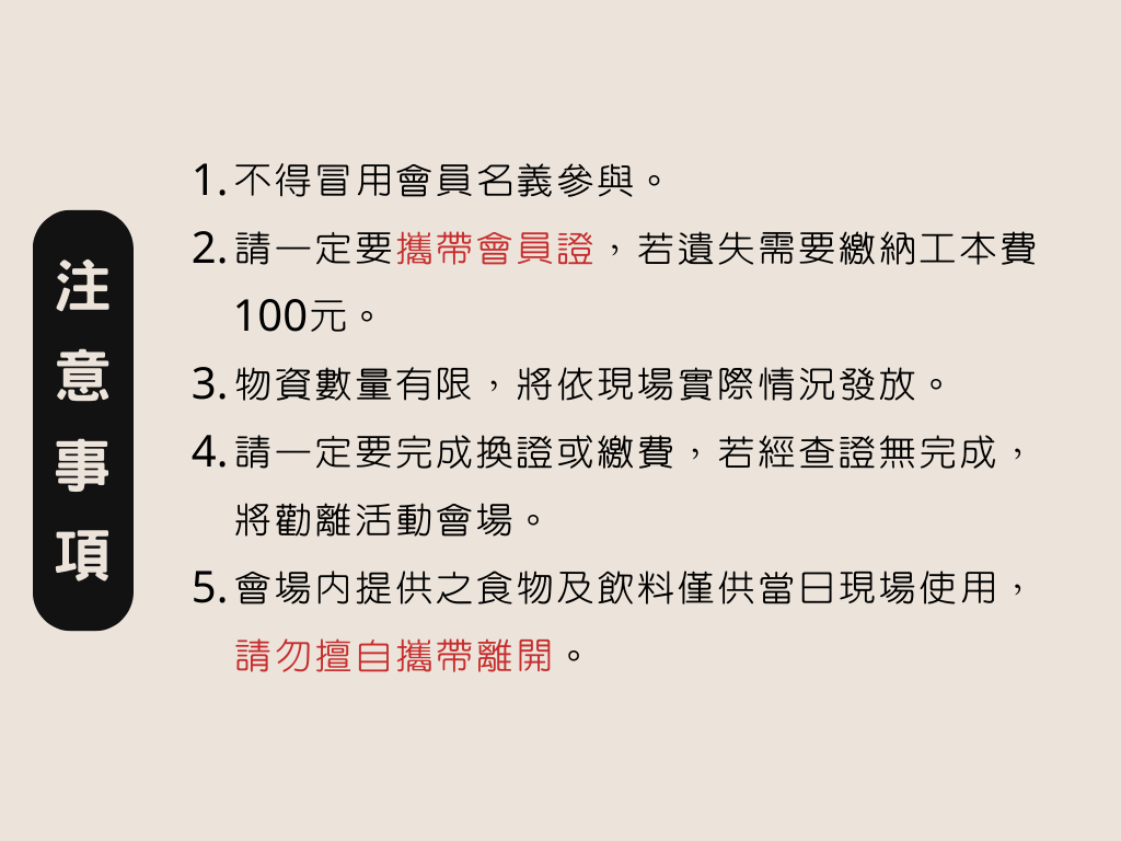 現場食物及飲料僅供當日會員使用,禁止外帶。